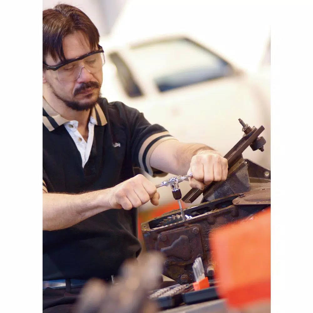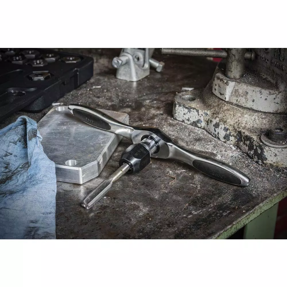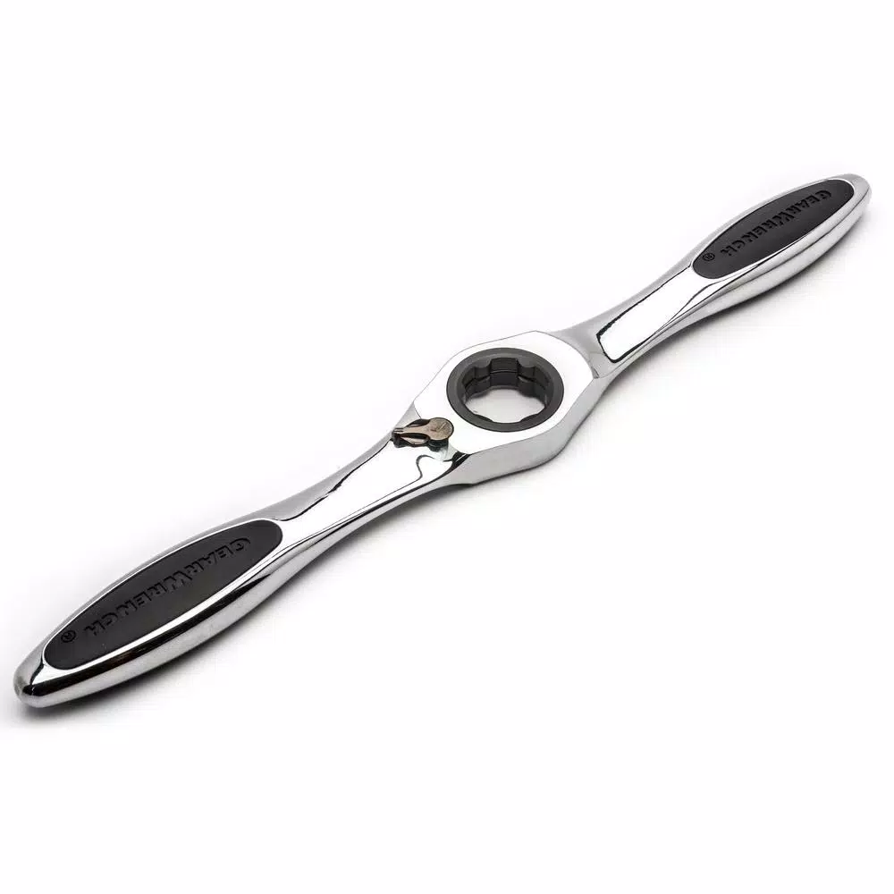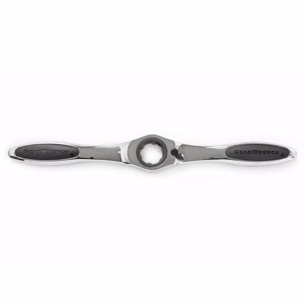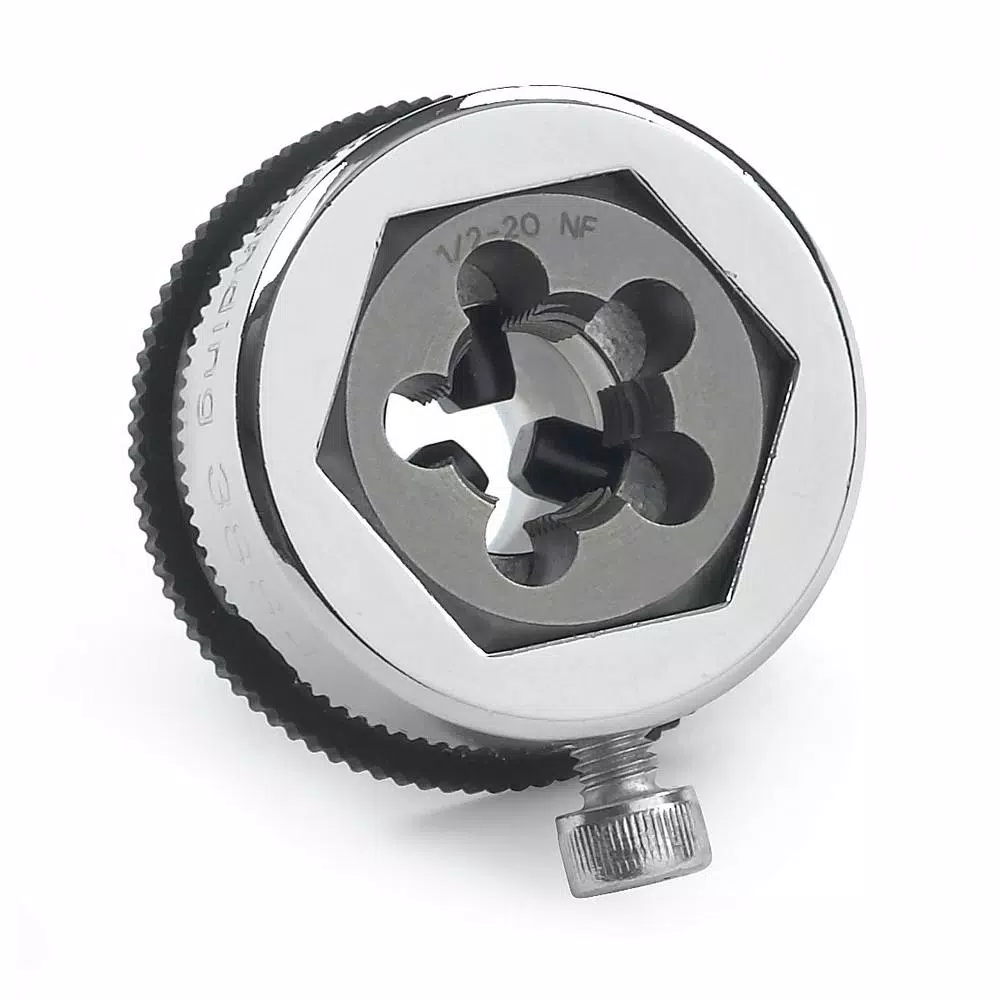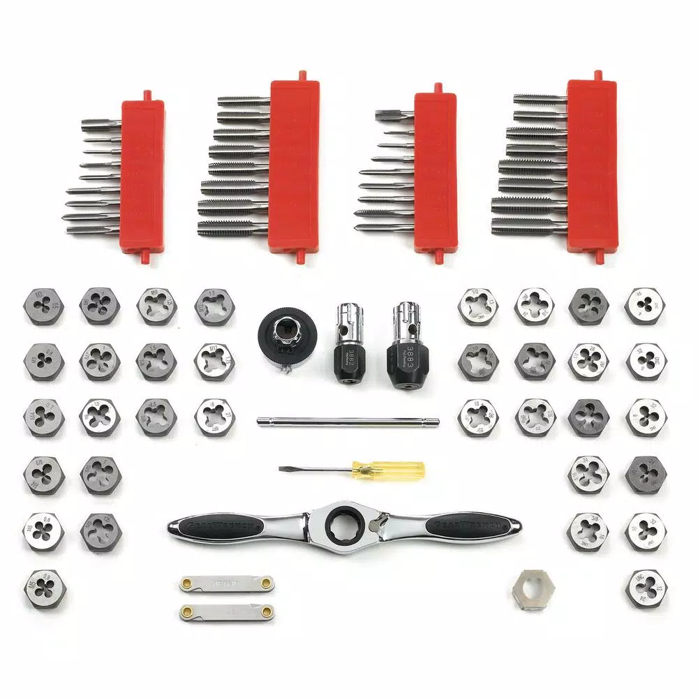 GearWrench 114-Piece large ratcheting tap and diet set SAE/metric, consisting of: 82800 large ratcheting T wrench, 82801 large locking tap adapter, 82802 large hex die adapter, 3881 medium ratcheting T wrench, 3883, medium tap adapter, 3882 small tap adapter, 3884 medium die adapter, 82803 male extension adapter, 82804 female extension adapter, sliding T for adapters, 4 mm hex key, 5 screw extractors, metric thread gauge, SAE thread gauge, 48 taps and 48 dies. Complete set of 48 taps and 48 dies, plus small, medium and large system of ratcheting T handles, locking tap adapters and hex die adapters. Taps and dies are made from high quality carbon tool steel. Gear wrenches ratcheting -I handle systems are perfect for the master Mechanic or Machine Shop. Set comes with blow molded case for safe and organized storage. 5° ratcheting arc with reversible lever eliminates hand over hand turning Patented Twist Lock guide system reduces back walk of die guide Extension adapters provide access in tight confined areas. Length of tap and die system can be extended by combining adapters and any 3/8 drive extension. Tap holders tilt down for easy access keeping taps secure and organized Works with round and hex shaped dies Includes 4-40 to 3/4 and 3 to 18 mm sizes.