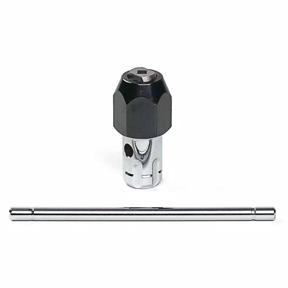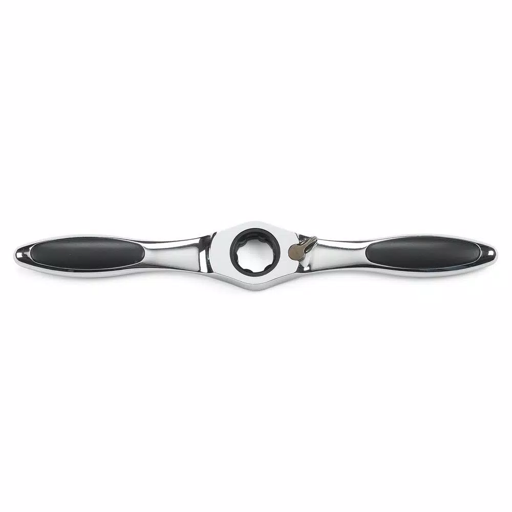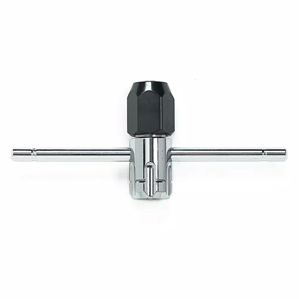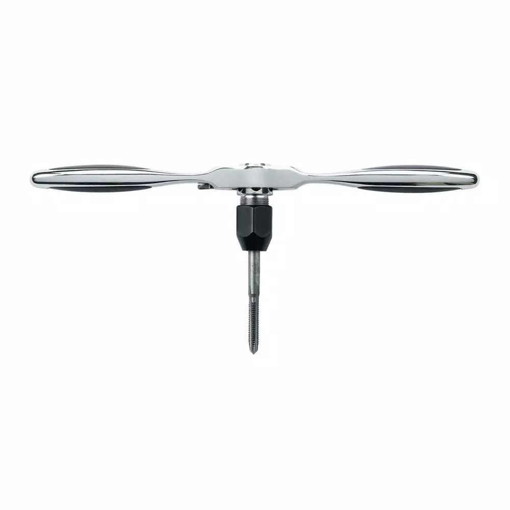 Patented Twist Lock Guide System reduces back walk of die guide and keeps dies centered while cutting threads. Reversible lever with 5 degree ratcheting arc eliminates hand-over-hand turning. Ideal for working in tightly confined areas. Kit features the Ratcheting “T” wrench and adapters