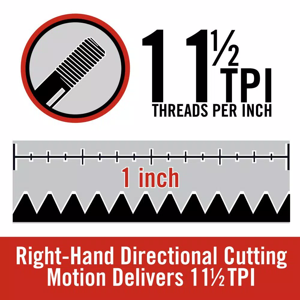 - Right-hand directional cutting motion delivers 11-1/2 TPI from die head