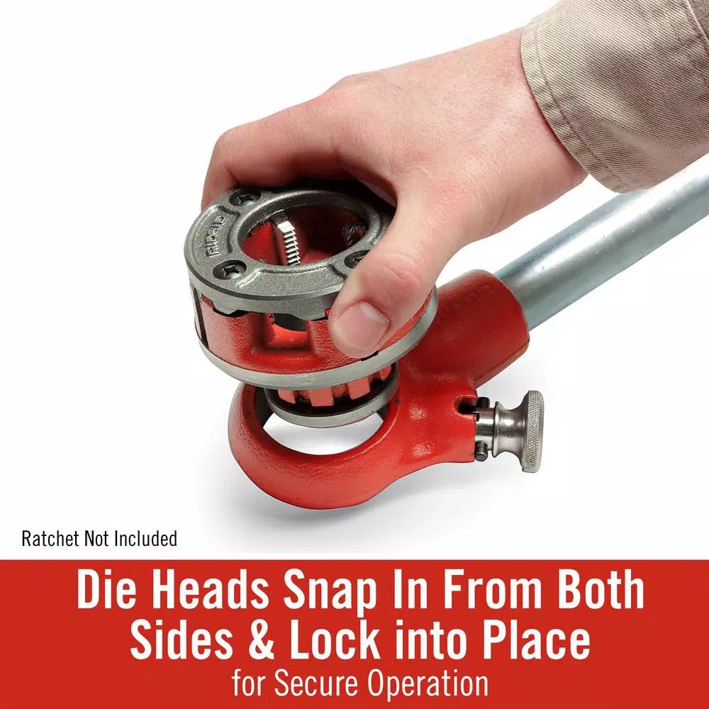 Designed for use with the RIDGID OO-R Ratchet and Handle Assembly, the RIDGID OO-R Alloy Die Head comes with 1 in. manual dies for cutting clean, precise threads. This is the tool you want for quick, efficient pipe threading. The convenient, factory set 12R RIDGID die head is built for longevity and creates an American Standard National Pipe Thread (NPT) seal that is ideal when cutting threads for mechanical, low-pressure air or fluid applications. The super-efficient OO-R model produces exacting right-hand directional threads on metal pipes that measure up to 1 in. NPS, creating clean 11-1/2 TPI.